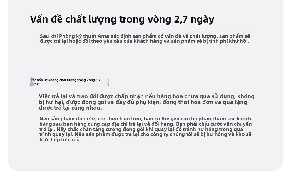 Trả lại hoặc trao đổi trong vòng 7 ngày kể từ ngày giao hàng.