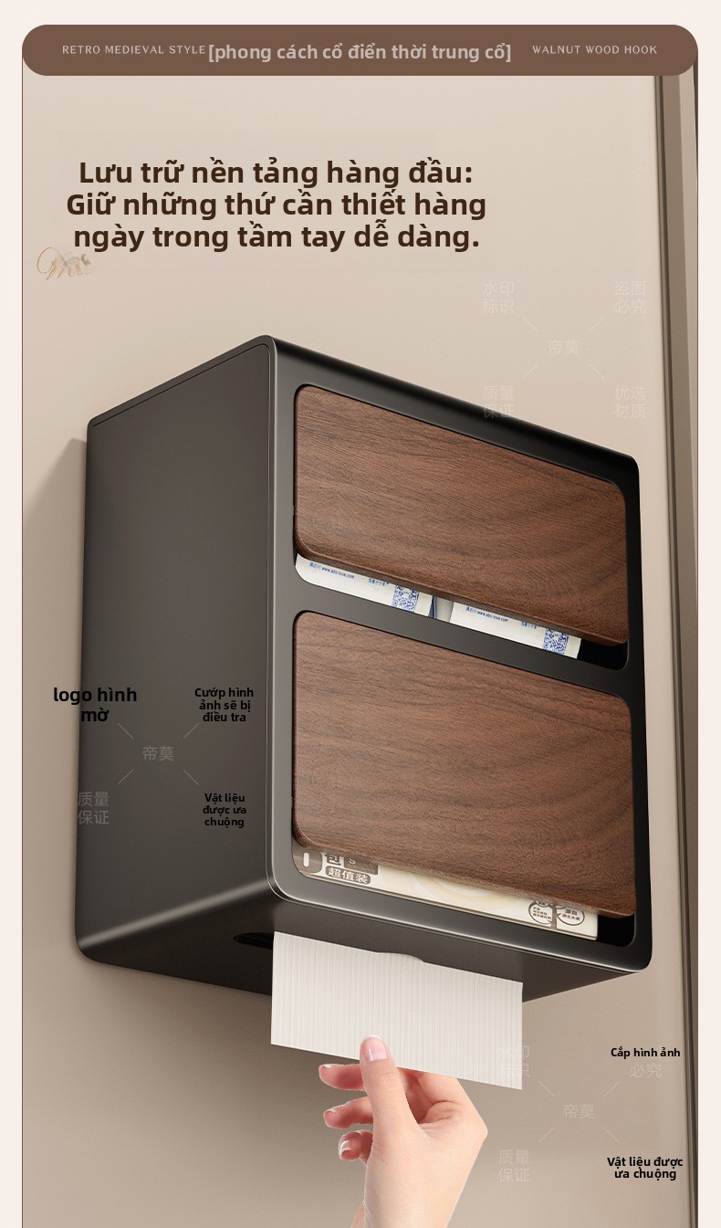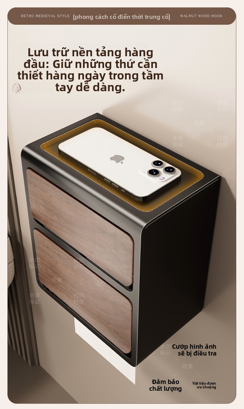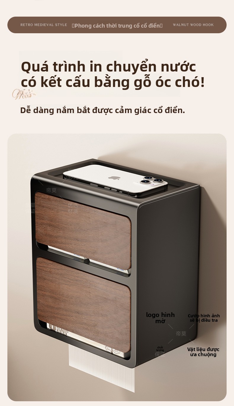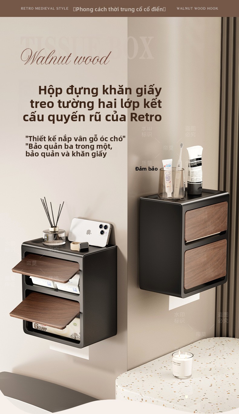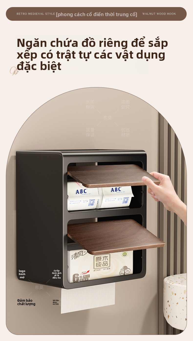 Hộp khăn giấy hai lớp treo tường hạt gỗ trung cổ nhà vệ sinh miễn phí đục lỗ giá đỡ giấy vệ sinh hộp